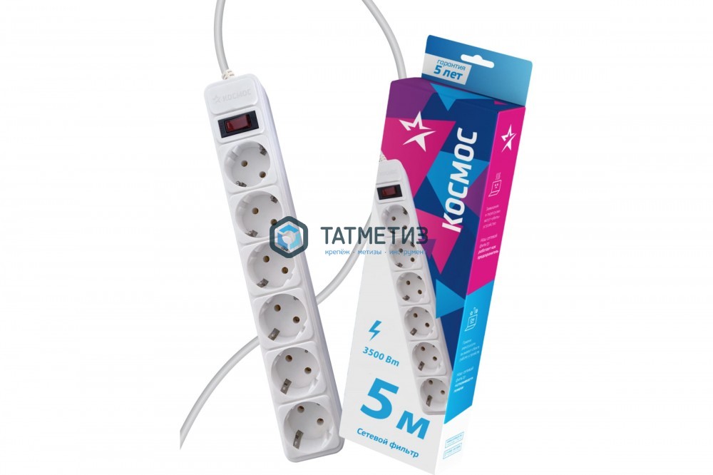 Удлинитель с сет.фильтром 6 х 5м с/з 16А IP20 3.5кВт 3х1 с предохр. с выкл. с инд.сети, КОСМОС